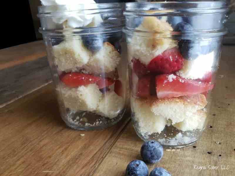 To make it a special treat, you can use 8oz jelly jars and serve individual portions. You can also just use a pan and combine the ingredients for a party. Perfect for the 4th of July patriotic party.